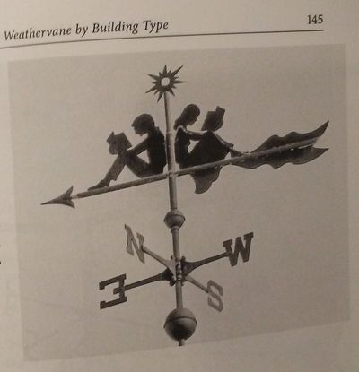 "Finally, in this category we end with those weathervanes that simultaneously extoll the virtues and joy of reading from an early age and offers up an outside invitation to patrons of all ages to clearly see what lies within. These ideals are clearly reflected in the design of the Gilman Library in Alton, NH, which depicts in silhouette form two young adults, a boy and a girl, sitting back to back while reading a book. The image for this vane was designed by local artist Peter Ferber, the vane put in place in 1997. It was purchased for the town by the Gawlicki family in memory of their father, Edward Gawlicki. It is not only a beloved symbol of library patrons in Alton, but has become the library logo, depicted on bookmarks, business cards, and newsletters."